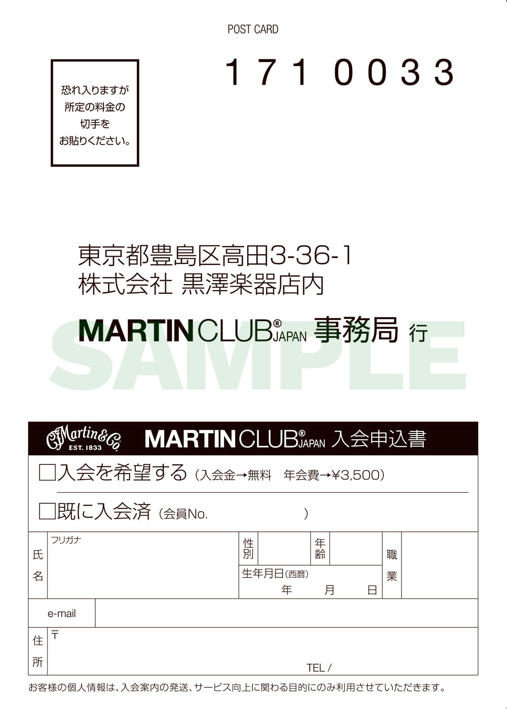 新品の正規輸入品マーティンギターをご購入頂き、添付のアンケートはがきにて入会申込をされた場合、入会金¥3,500が無料となります。入会希望の方は、入会申込書をお送りしますので住所・氏名・電話番号を下記までご連絡下さい。